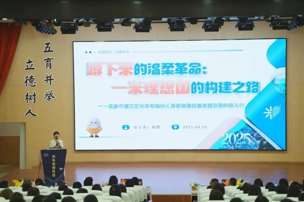 成都市温江区光华实验幼儿园教育集团总园长何煦以《蹲下来的温柔革命:一米理想国的构建之路》为题作新学期工作部署。她从“思想建构的内涵体系”“思想根植的时代基因”与“思想践行的实施路径”三大维度,系统阐释了“一米教育”思想在新学期的实施路径与发展蓝图。何煦园长强调,集团将坚持以“一米教育”理念为引领,持续推动“蹲下来的温柔革命”,构建真正以儿童为中心的教育理想国,为培养担当民族复兴大任的时代新人提供“温江样本”。