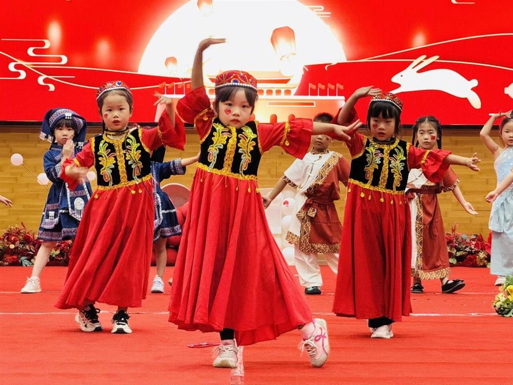 在悠扬的民族旋律中,鹏幼娃们身着各色民族盛装,自信登场。孩子们以童真步伐展现民族风情,诠释着“五十六个民族,五十六个家”的团圆意象。一家亲的温暖情谊,随音乐流淌,感染全场。