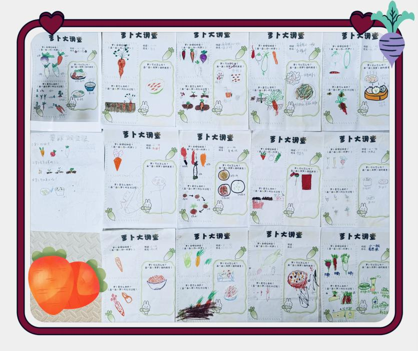 对萝卜有了初步的认识后,孩子们对萝卜更加有兴趣。你们还知道萝卜有什么小秘密呢?国庆假期和爸爸妈妈一起完成了“萝卜大调查”!