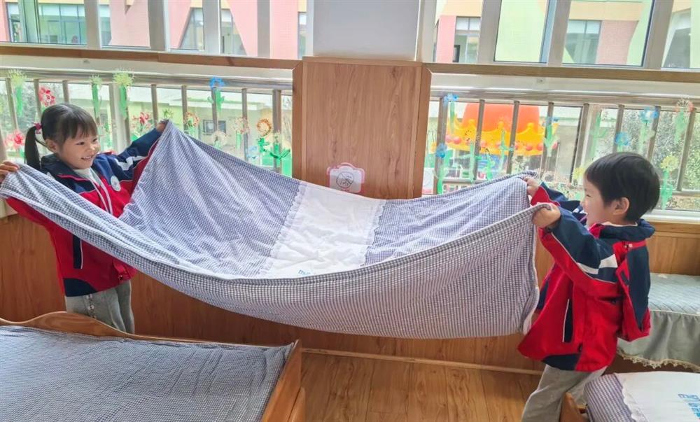 孩子们迫不及待用上新方法,有的两两合作抻平被子,有的学着用夹子固定边角,小心翼翼地尝试新叠法。