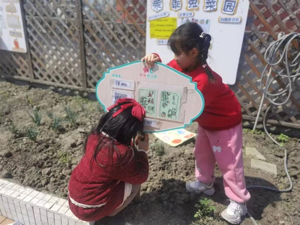 种植结束后,孩子们不仅为菜地制作了实物标牌,还为菜地拍摄了第一张“证件照”贴在标牌上,让“蔬菜总动员”里既有烟火气,又有专属记忆,在实践中体会劳动的快乐。